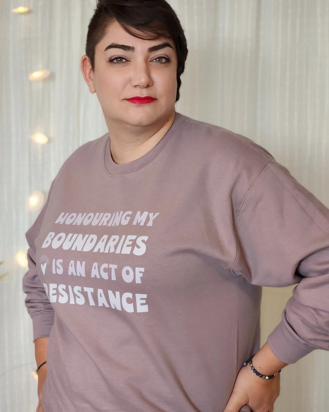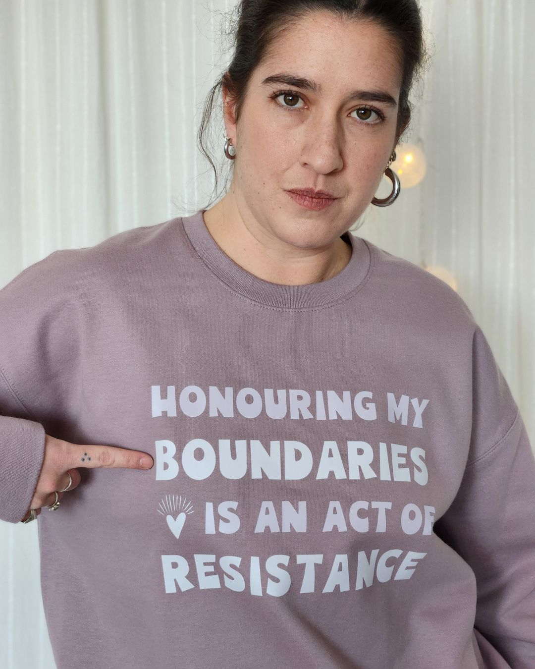 HONOURING MY BOUNDARIES IS AN ACT OF RESISTANCE. Wearing this sweatshirt means making a statement. In a world of relentless expectations, when one upholds their personal boundaries they are taking a stand towards safeguarding their space and well-being. It goes beyond self-empowerment. It is about questioning imposed norms and resisting oppressive systems that try to box us in. Let's make our boundaries non-negotiable - our personal space is sacred.