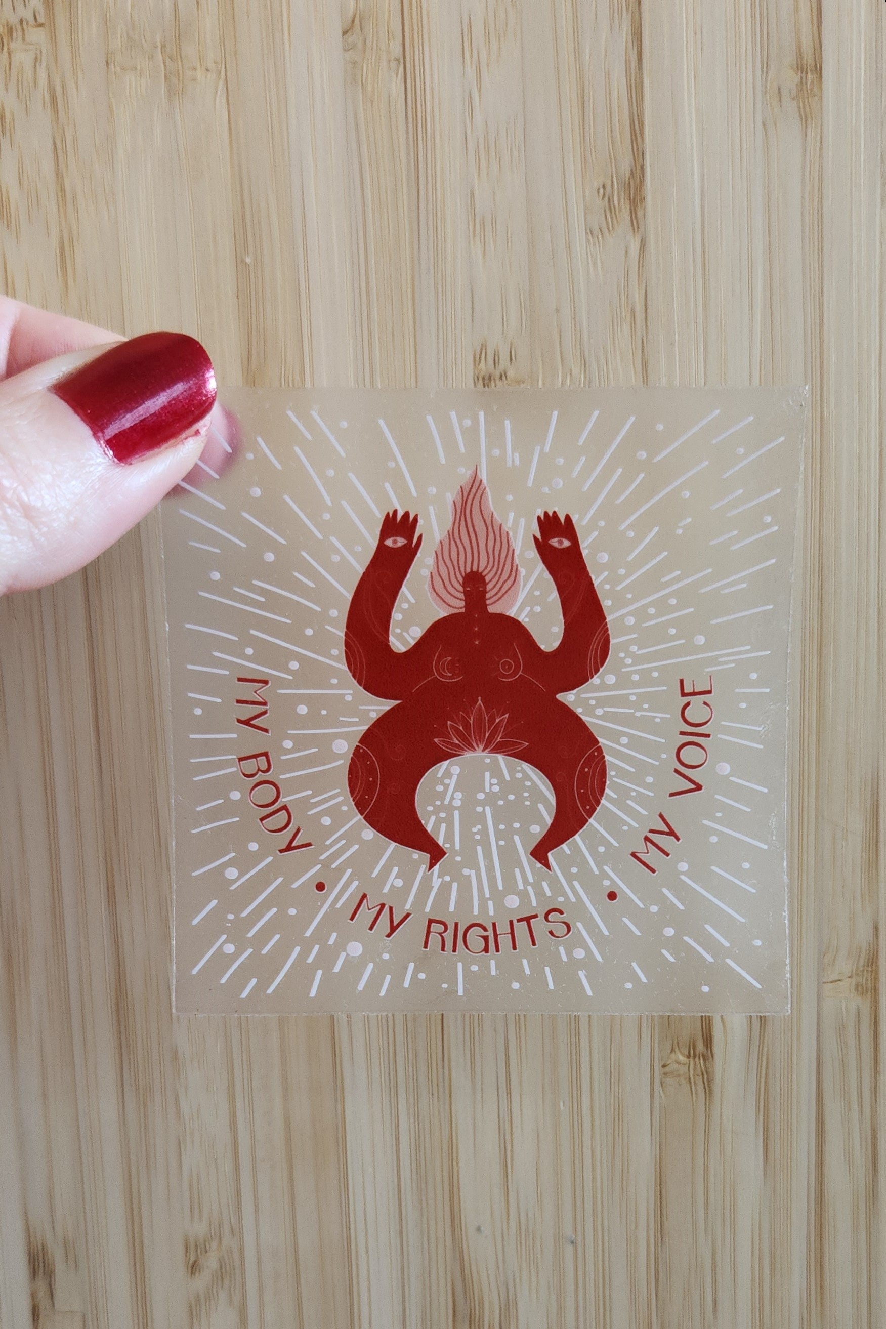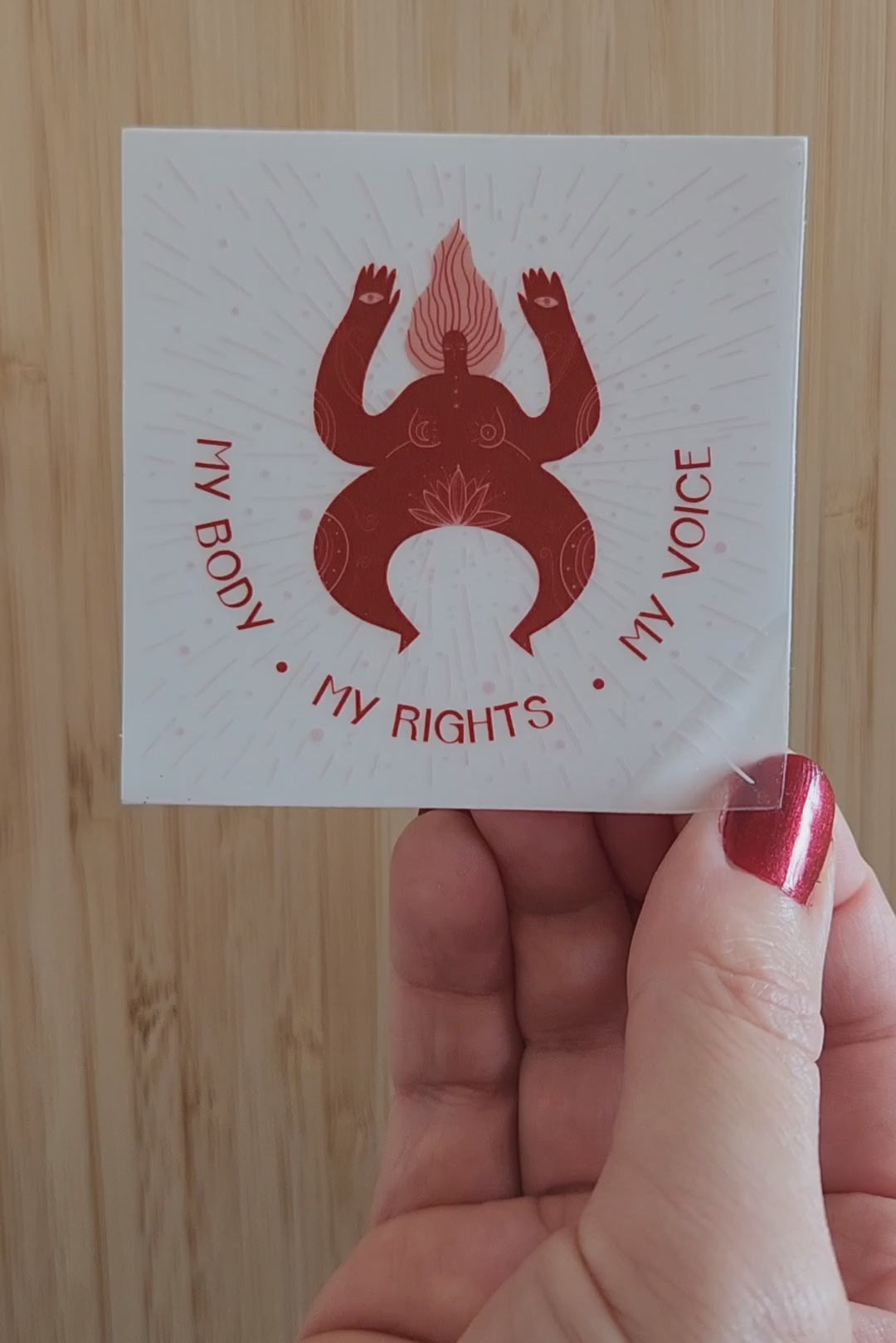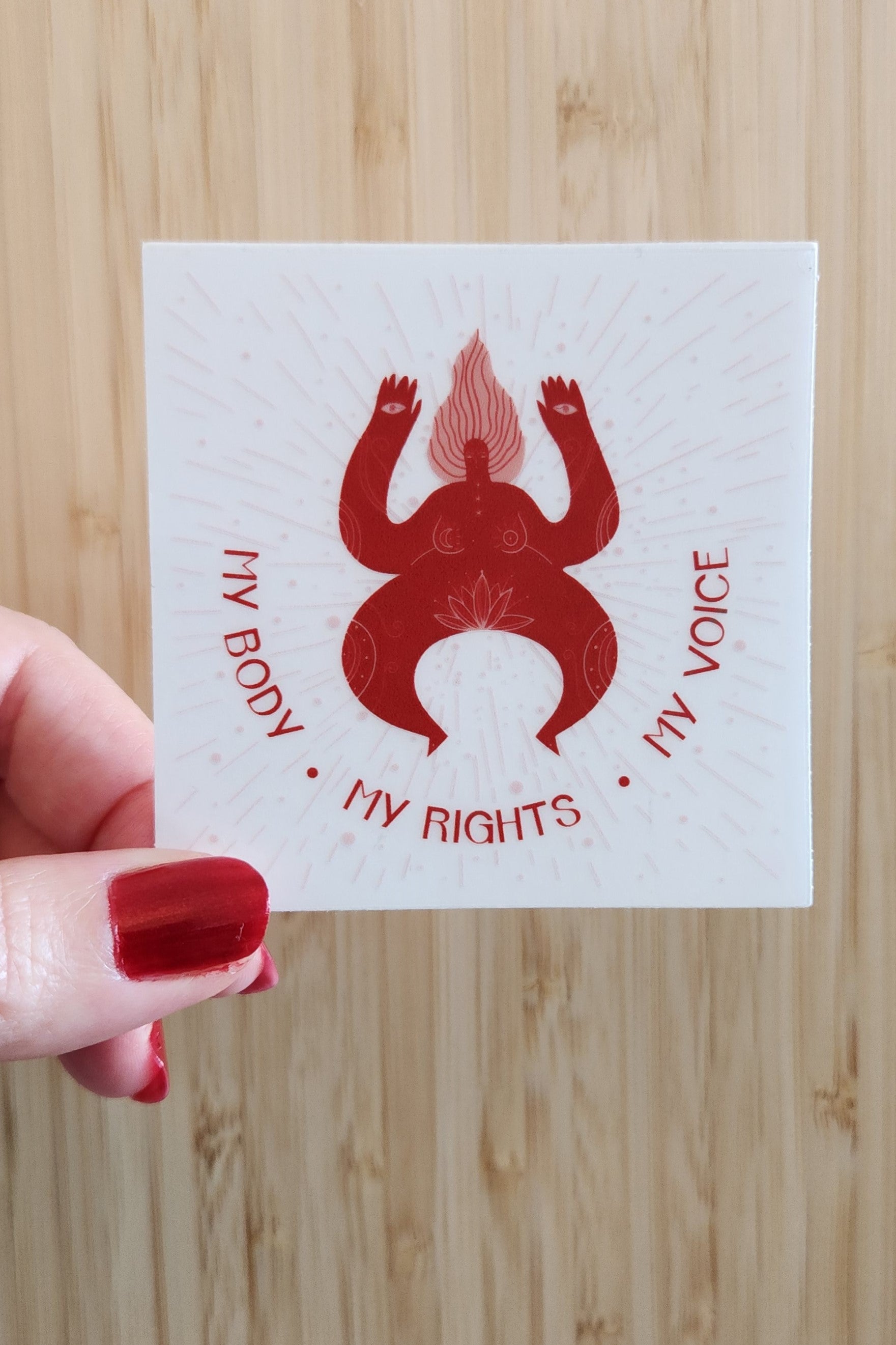 MY BODY ● MY RIGHTS ● MY VOICE STICKER. This is a fierce statement of self-determination and empowerment. It is a call to action to be an ally in the fight against the patriarchal system and its structures that have oppressed us for far too long. To be an advocate for the respect of women and LGBTQIA+ persons rights and sexual and reproductive rights - including making abortion safe, legal, and accessible. We must remember that the freedom and autonomy to make decisions about one’s own body should not be a matter of discussion because they should be a right guaranteed and promoted by all societies.